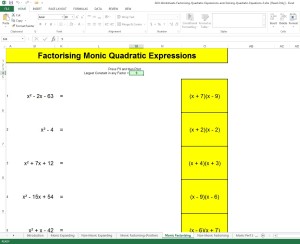 Screen Capture ~ Excel File for Developing Factorising Quadratic Skills